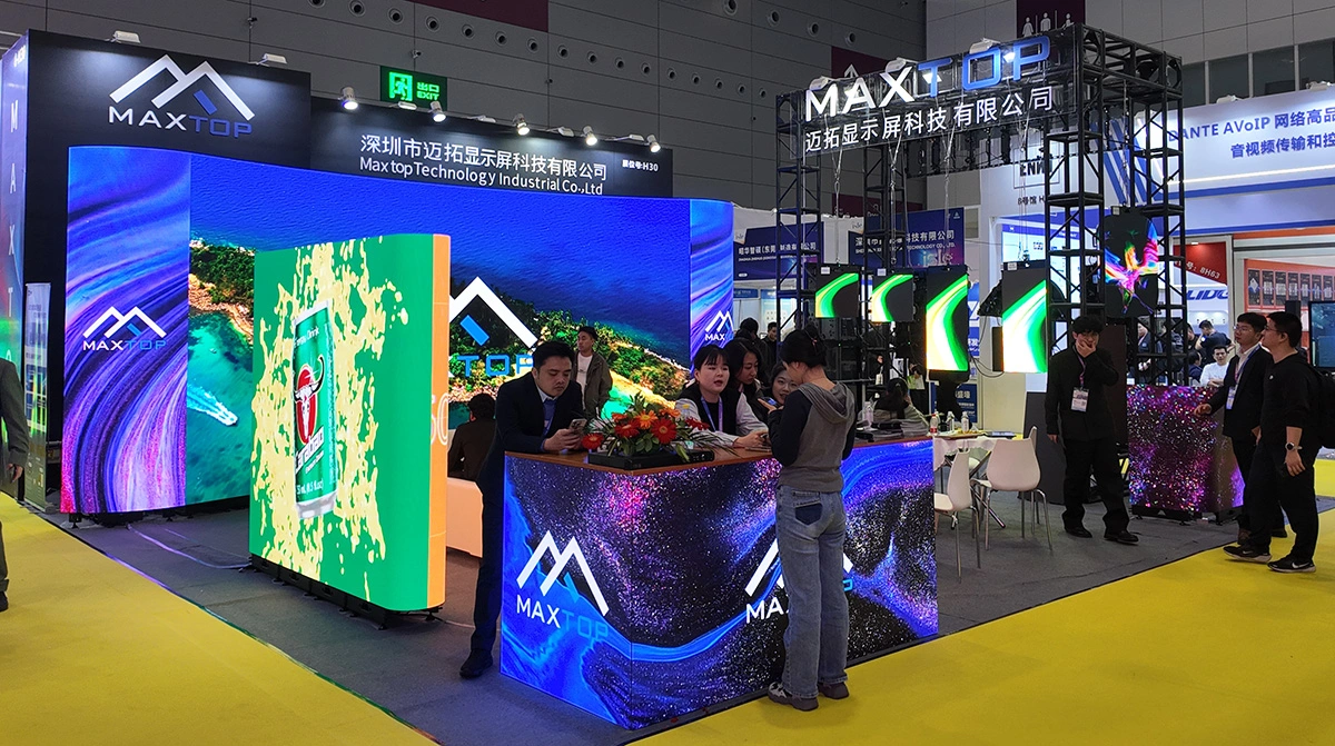 The heart of our booth was a powerful, multi-format video wall that captivated visitors. It featured a massive 5.5m x 3m main screen built with ultra-high-definition P1.9 AC series LED panels, flanked by two 1m x 3m auxiliary screens utilizing the high-brightness P2.6 AU series. This configuration masterfully demonstrated seamless mixing of pixel pitches for optimal viewing distances and highlighted superior color matching across different product lines.